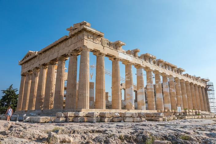 Le Parthénon d'Athènes est situé dans l'Acropole, la citadelle construite sur la partie haute de la capitale et servant à l'époque de la Grèce antique de position de défense en cas d'attaque ennemie. Construit au VIe siècle av. J.-C., le monument de marbre est consacré à Athéna, déesse de la sagesse et de la stratégie guerrière. Largement pillé et détérioré à travers l'histoire, le Parthénon est une source d'inspiration architecturale à travers le monde.