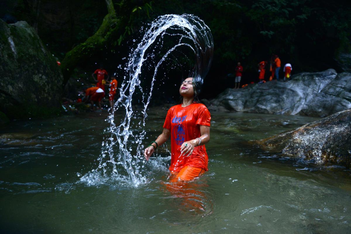 Mulher toma banho no rio Bagmati, Katmandu, Nepal